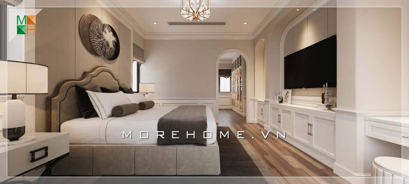 Một không gian phòng ngủ rộng rãi đầy đủ tiện nghi là điều nhiều người ao ước sở hữu nhờ vào điểm nhấn chiếc giường tân cổ điển với cách bố trí nội thất một khách khoa học và ngăn nắp.
