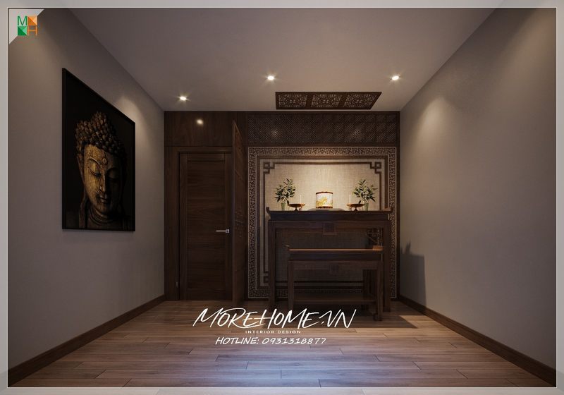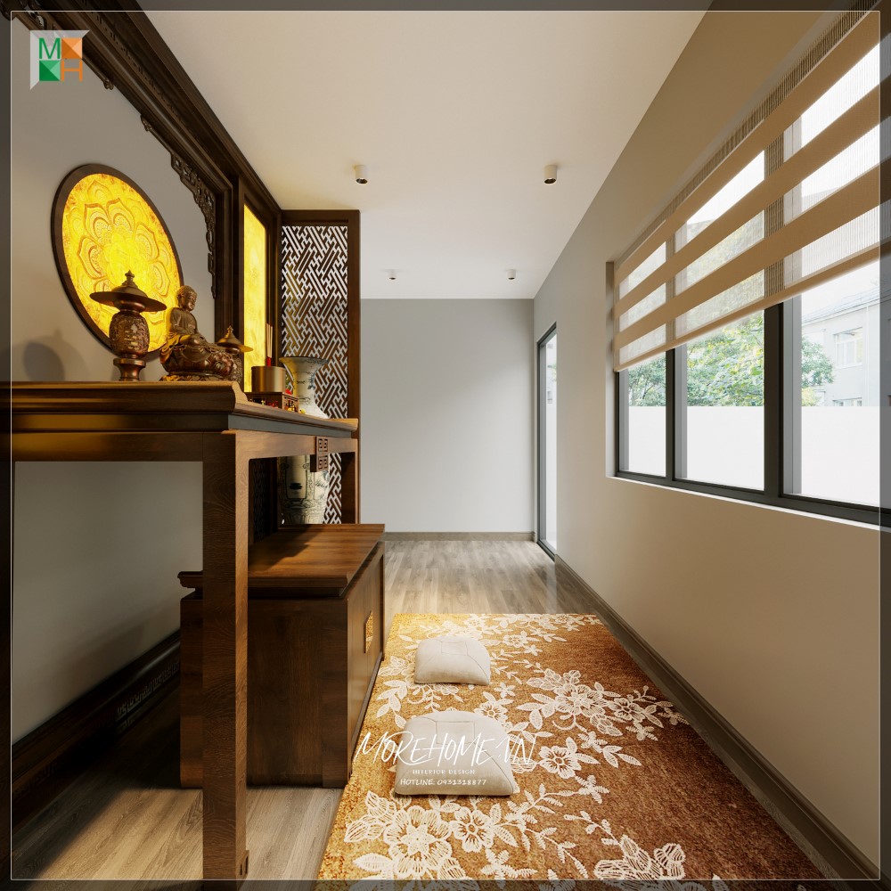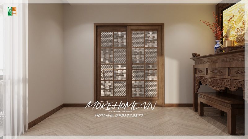 Gỗ cổ kính được sử dụng để vách ngăn bàn thờ, tạo ra một không gian riêng tư cho bàn thờ bằng cách kết hợp cả phong thủy và phong cách hiện đại.