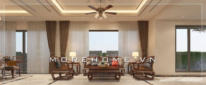 Phòng khách biệt thự tân cổ điển được thiết kế với nội thất gỗ tự nhiên cao cấp, giúp tạo nên một không gian sang trọng.