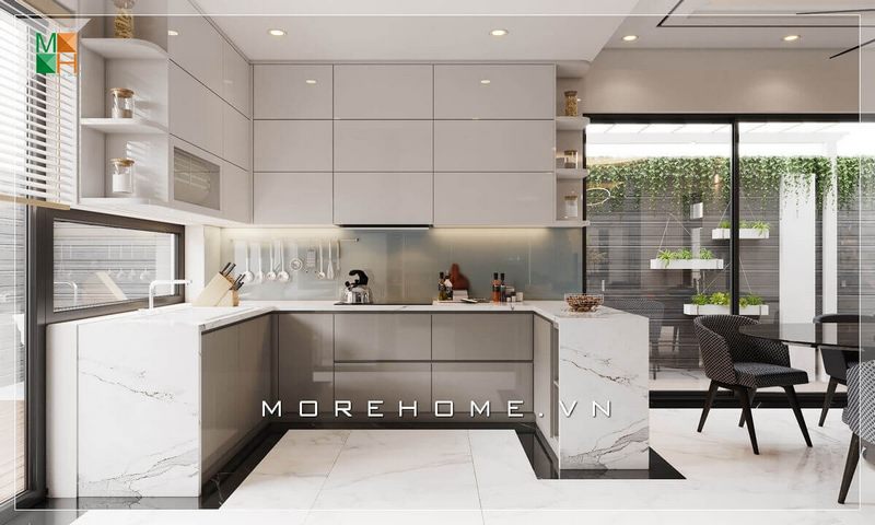 . Mẫu tủ bếp mới và độc đáo, trẻ trung được thiết kế để phù hợp với các căn biệt thự, nhà phố hiện đại cung cấp sự tiện nghi và sự sang trọng. Đá ốp bếp được sử dụng rộng rãi trên một phần tường lớn giúp tạo nên một vẻ đẹp bền vững qua thời gian.