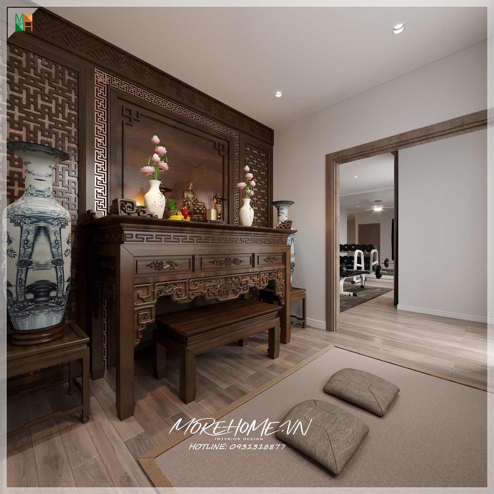 Chất liệu chính căn phòng thờ là gỗ óc chó tự nhiên cao cấp, sàn lát gỗ làm tăng sự sang trọng và sự đầu tư của gia chủ vào không gian nơi đây.