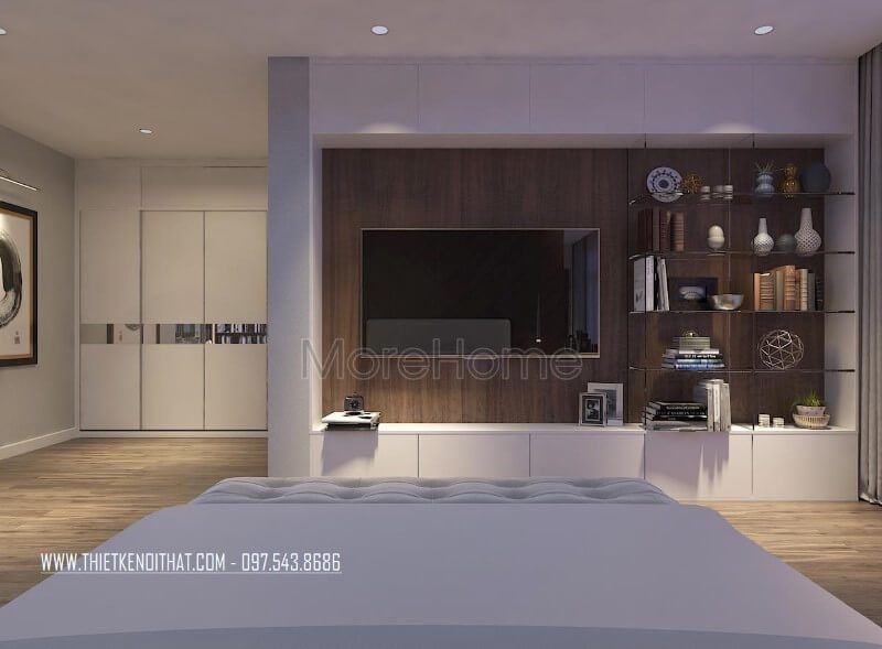 Với cách bày trí khéo léo cho phòng ngủ thêm sinh động, gia chủ lựa chọn kệ ti vi gỗ công nghiệp sơn trắng hiện đại kết hợp kệ trang trí bằngkính độc đáo và lạ mắt
