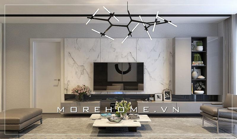 Lựa chọn thiết kế chung cư cao cấp bằng đá ốp vách tivi vân mây cao cấp cũng là chất liệu được gia chủ chọn giúp không gian căn phòng sáng và sang trọng hơn